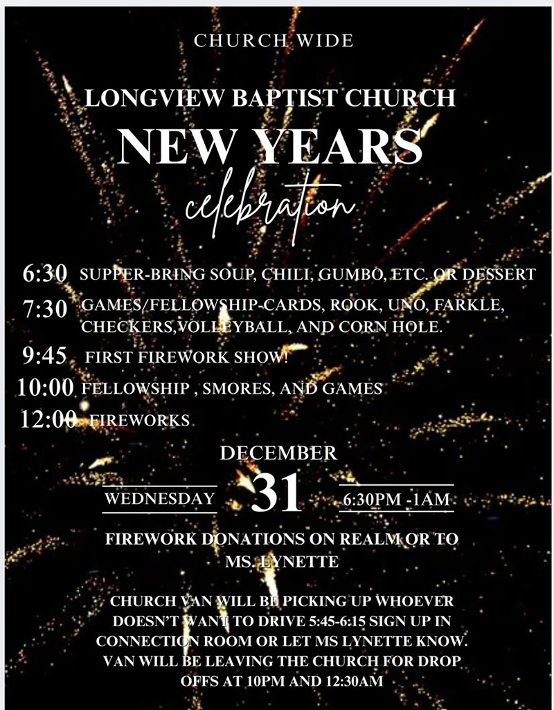 NEW YEAR'S CELEBRATION Join Us on the evening of December 31st, as we bring in the New Year together! Food, games, fireworks and more... We're hoping to see you there!!